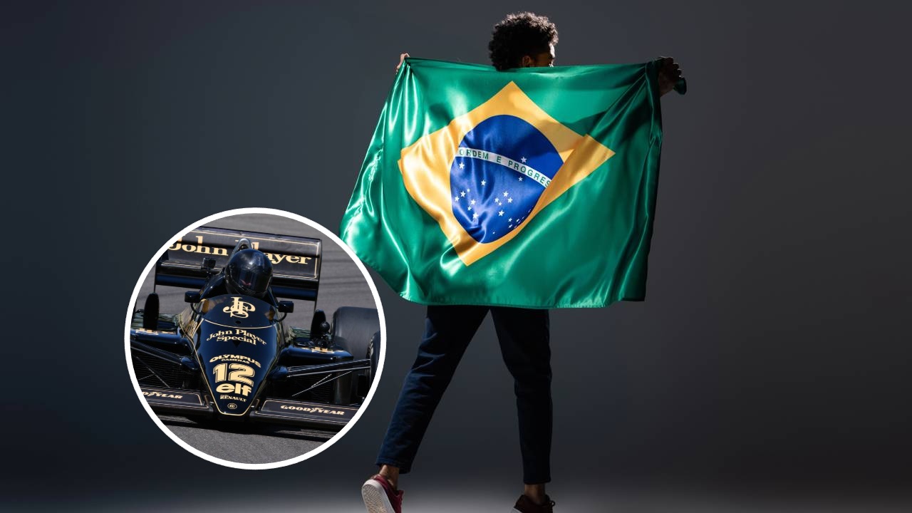 Homem segurando bandeira do Brasil com mosaico de carro da Lotus na F1 - Créditos: depositphotos.com / VitalikRadko e Créditos: depositphotos.com / Dan74
