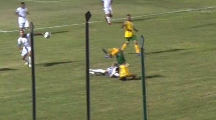 A “cama de gato” recebida por Toninho Bahia, aos 38 minutos do primeiro tempo, fez o jogador cair de mau jeito e, com fortes dores, deixou o campo de ambulância.