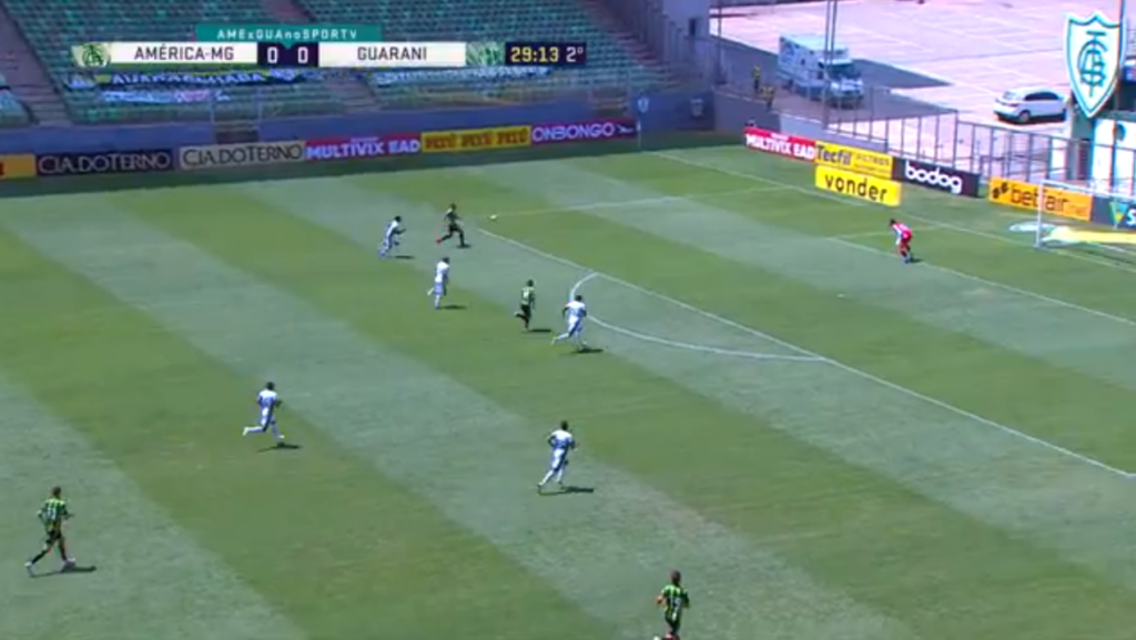 Mesmo assim, o América-MG não desistiu. Na sequência, Ademir chegou sozinho na área, ficou cara a cara com Gabriel, e bateu na trave. Felipe Azevedo bateu de fora, e a bola saiu tirando tinta do gol do Guarani.