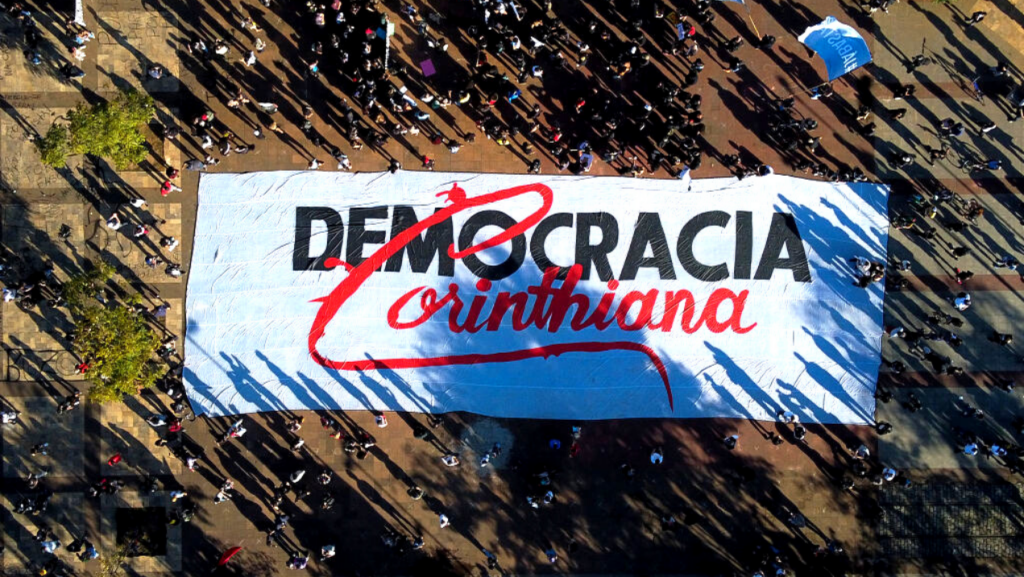 O Timão publicou uma foto de um ato de seu time na época da “Democracia Corinthiana”, período que aconteceu entre 1982 e 1983. Os jogadores entraram em campo com uma faixa com os dizeres: “Ganhar ou perder, mas sempre com Democracia”.