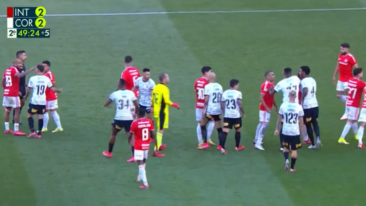 Jogadores de Internacional e Corinthians durante a confusão na partida do Brasileirão (Crédito: Transmissão Premiere)