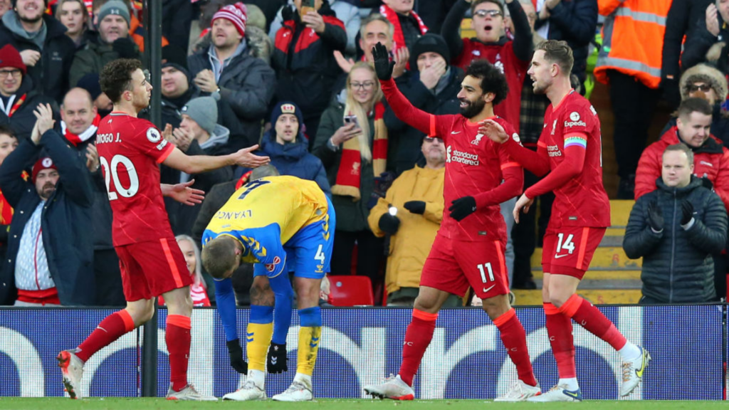 O primeiro gol dos Reds foi marcado com um apenas um minuto e meio de partida, por Diogo Jota. Após linda jogada entre o lateral Robertson e o atacante Sadio Mané, o camisa 10 deu o passe rasteiro por baixo das pernas de Bednarek e encontrou o português, que recebeu na área e finalizou para o gol: 1 a 0.