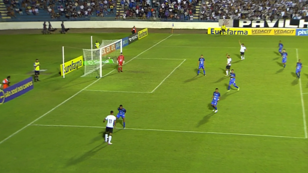 Já na segunda etapa, o Corinthians voltou determinado a buscar a vitória, mas demorou para encontrar o caminho do gol. Aos 12 minutos, Arthur Souza recebeu ótimo cruzamento de Pedrinho e cabeceou nas mãos de Bruno. Após bastante insistência, a equipe alvinegra teve sucesso no campo de ataque.