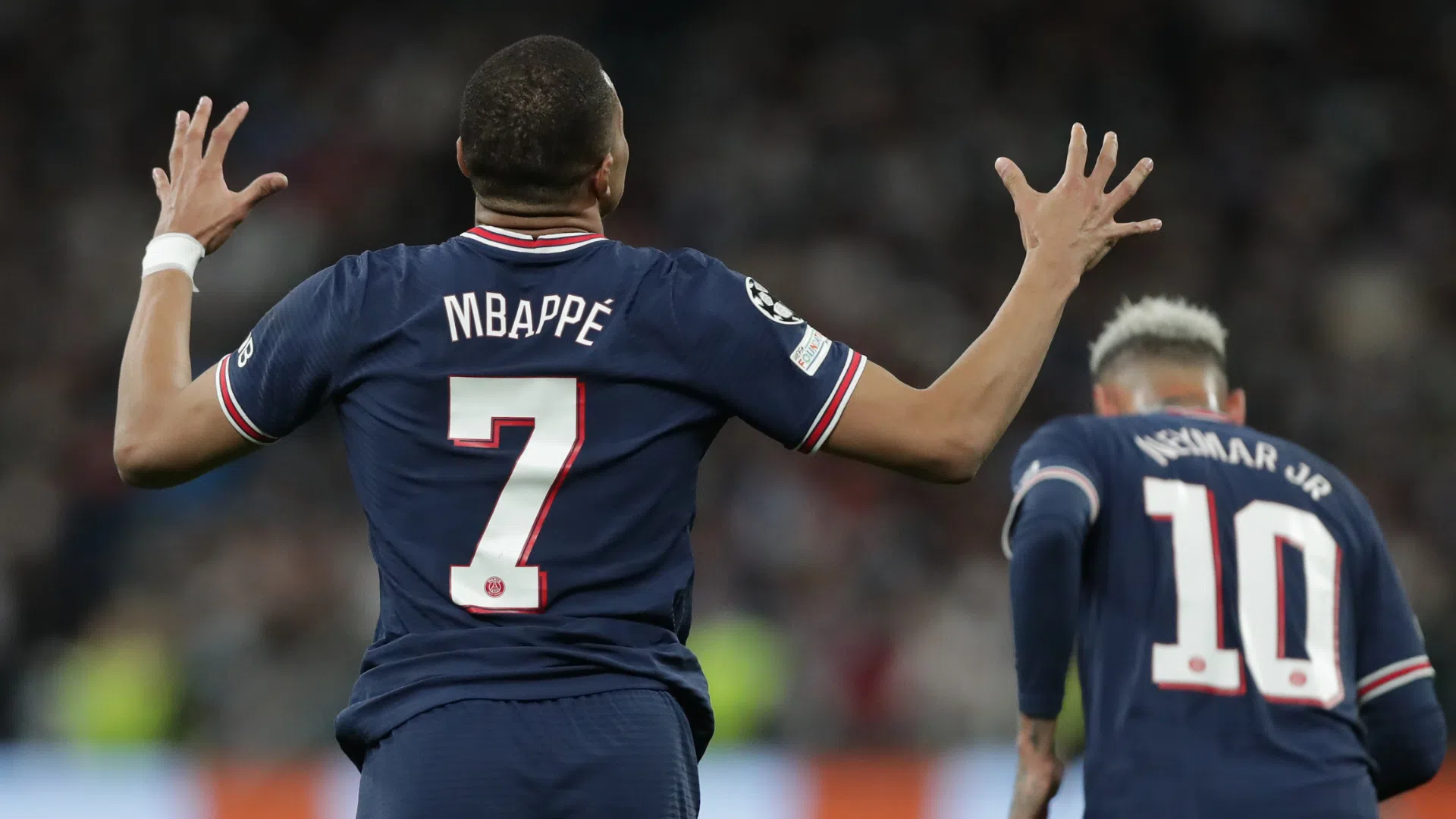 Mbappé, jogador do PSG comemorando o gol em campo