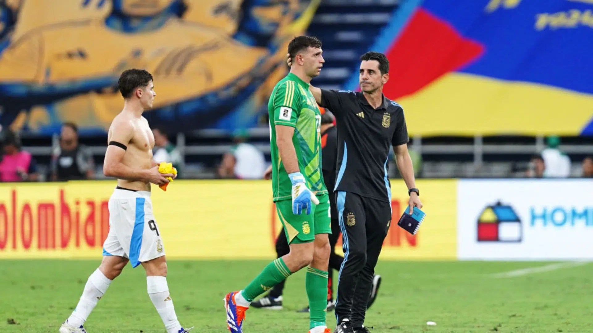 “A Acord Colômbia rejeita veementemente o ato de agressão do goleiro argentino Emiliano Dibu Martínez a um cinegrafista no final da partida. Jogar o equipamento do cinegrafista no gramado é um ataque à liberdade de expressão que nosso sindicato não admite. A Acord, como autoridade jornalística esportiva no país, exige que a FIFA gere uma sanção exemplar contra o senhor Emiliano Dibu Martínez, que não é um exemplo para as novas gerações”, disse a associação colombiana em comunicado.
