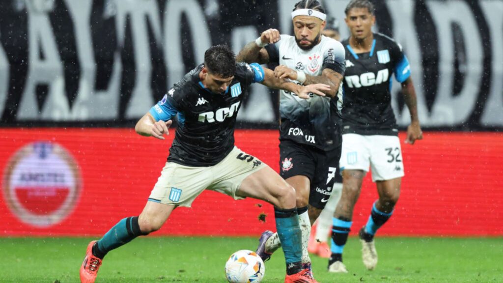 Memphis Depay, do Corinthians, disputa a posse de bola com Juan Nardoni, do Racing, em partida válida pela semifinal da Sul-Americana