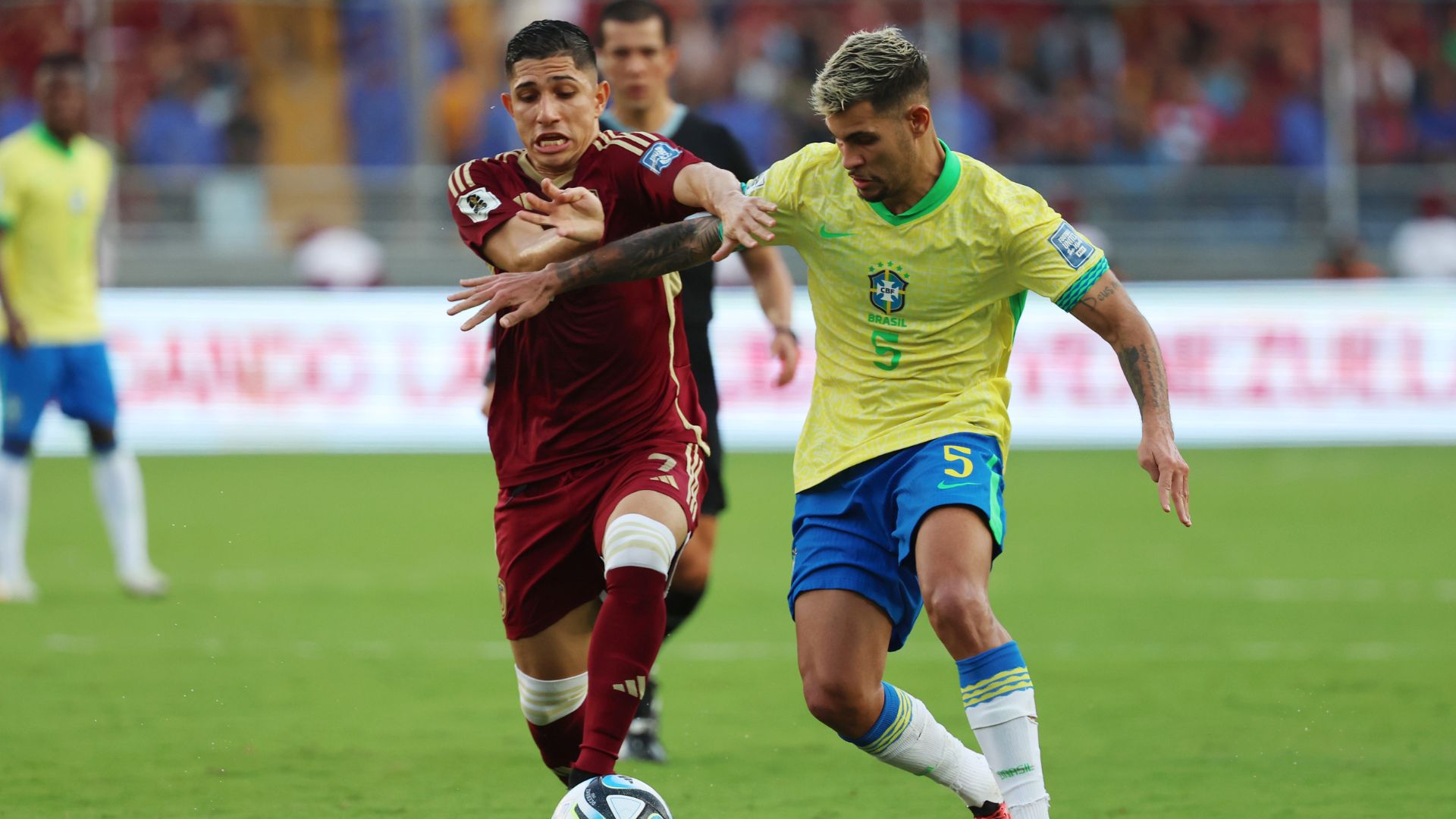 Bruno Guimarães e Savarino disputando por posse de bola, em Venezuela x Brasil