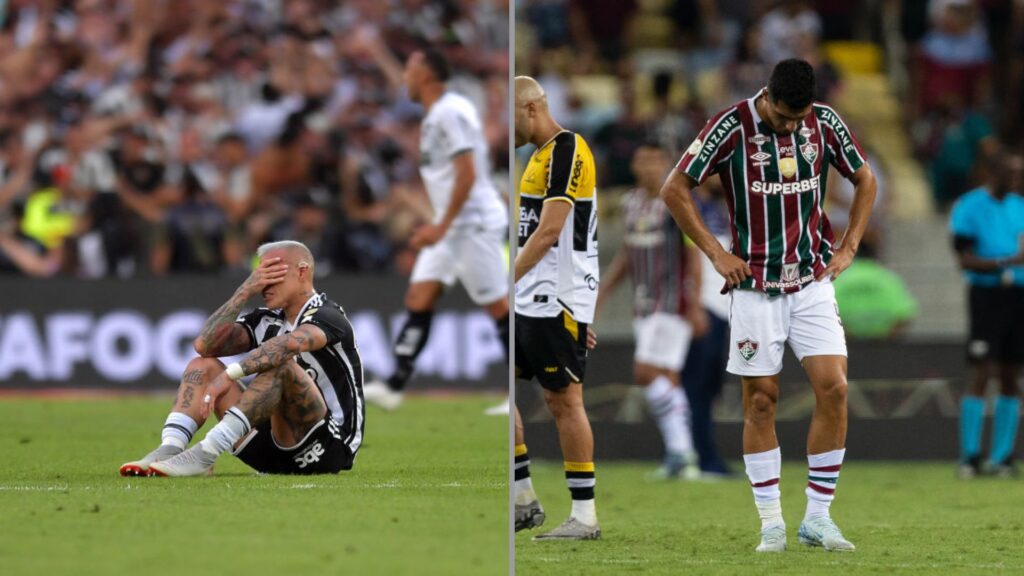 Na imagem à esquerda, Eduardo Vargas, do ATlético-MG, lamenta o vice-campeonato da Libertadores contra o Botafogo. Na imagem à direita, Kevin Serna, do Fluminense, lamenta o empate contra o Criciúma pelo Brasileirão