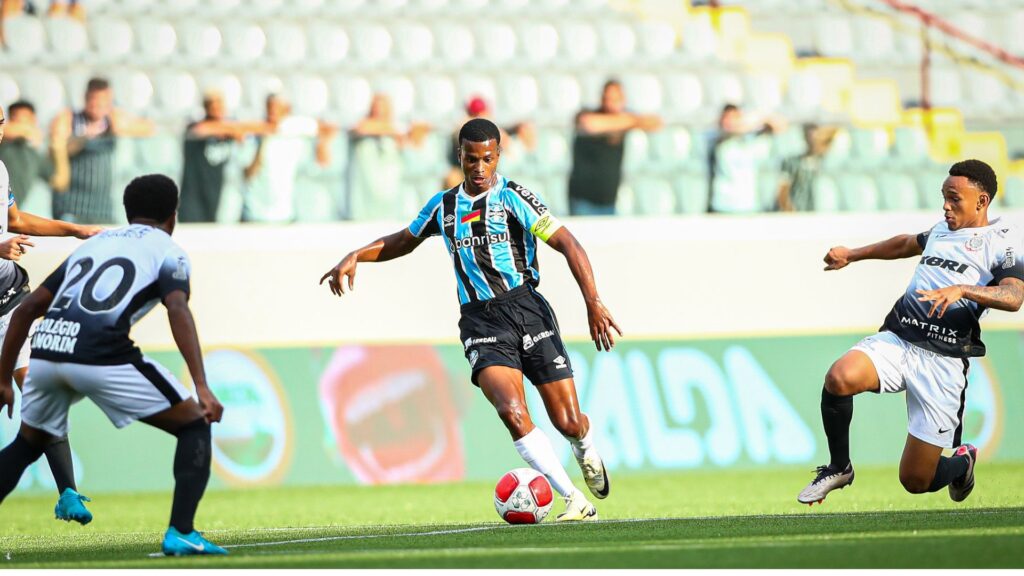 O Grêmio começou a partida buscando impor seu ritmo e quase abriu o placar logo nos primeiros minutos. Jeferson arriscou, mas parou em uma boa defesa de Kauê, goleiro do Corinthians. No entanto, foi o time paulista que saiu na frente. Aos oito minutos, Denner cobrou escanteio pela esquerda, e Bahia aproveitou a liberdade na área para cabecear no canto, sem chances para o goleiro Ygor.