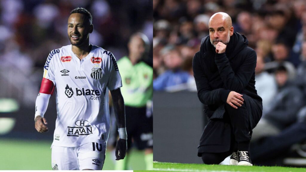Na imagem à esquerda, Neymar, do Santos. Na imagem à direita, Pep Guardiola, treinador do Manchester City