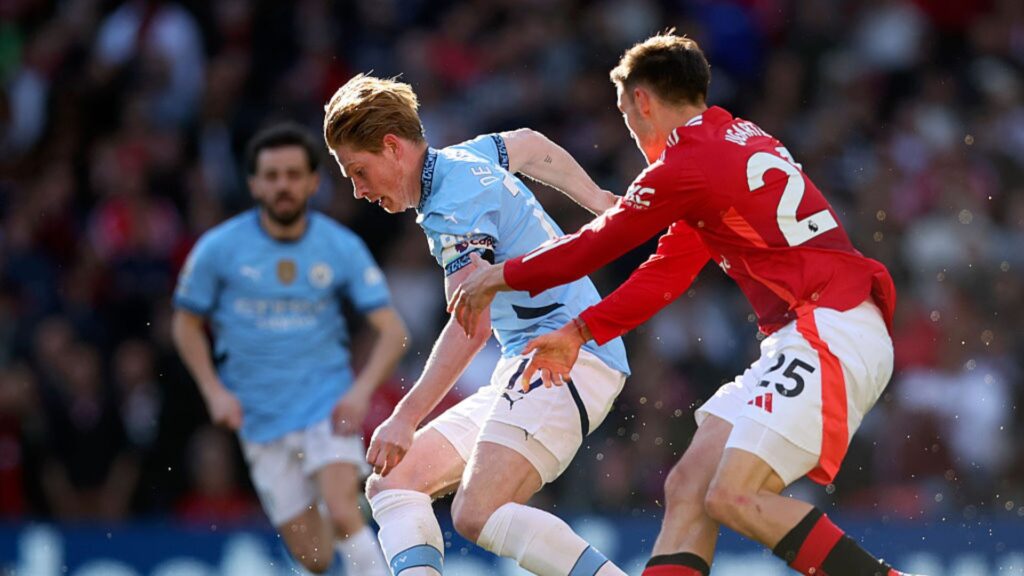 Manuel Ugarte tentou responder aos 25, com um belo voleio de primeira após passe de Bruno Fernandes, mas a bola passou com perigo à esquerda do gol de Ederson. O United cresceu no jogo e promoveu uma blitz contra a defesa dos Citizens. Primeiramente, Zirkzee, que acabara de entrar, recebeu passe de Dorgu e obrigou o goleiro brasileiro a defender à queima-roupa. Na sobra, Mount tentou de primeira, mas Gvardiol apareceu no caminho, levando a bola à linha de fundo.