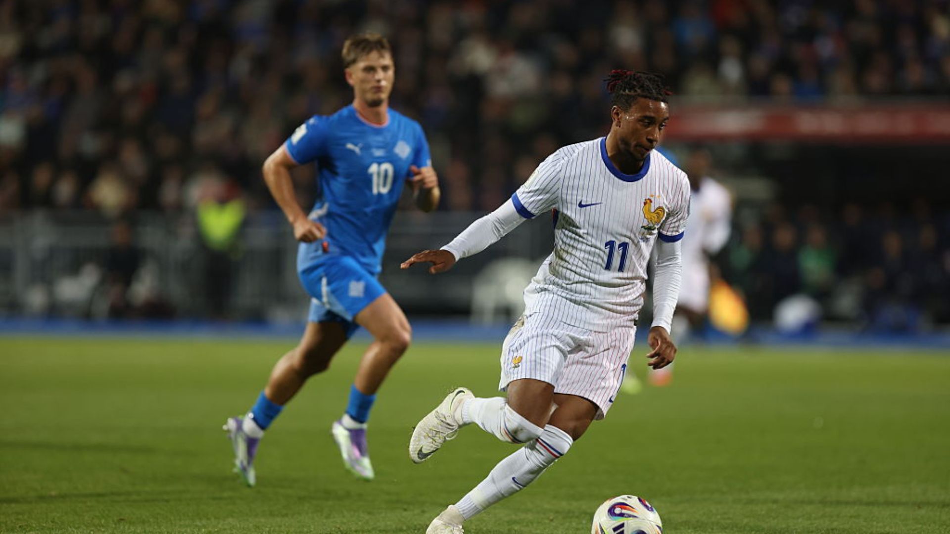Olise, da França, em jogo contra a Islândia