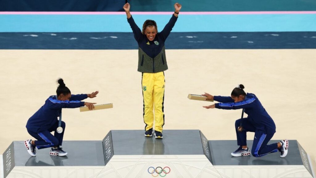 Em uma cena que ficará marcada na história da Olimpíada de Paris 2024, as ginastas norte-americanas Simone Biles e Jordan Chiles protagonizaram um momento de respeito ao reverenciar a brasileira Rebeca Andrade no pódio da final do solo. Rebeca conquistou a medalha de ouro na prova, superando as duas estrelas dos Estados Unidos, e recebeu com sorrisos a homenagem das adversárias.