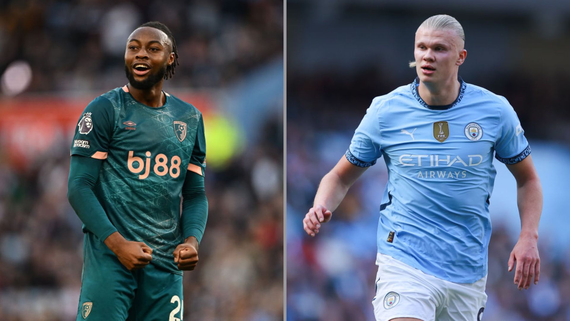 Na imagem à esquerda, Antoine Semenyo, do Bournemouth. Na imagem à direita, Erling Haaland, do Manchester City