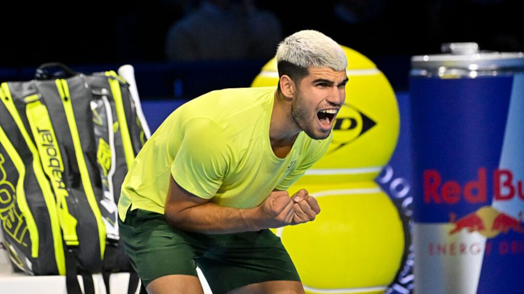 Alcaraz comemorando vitória no ATP Finals