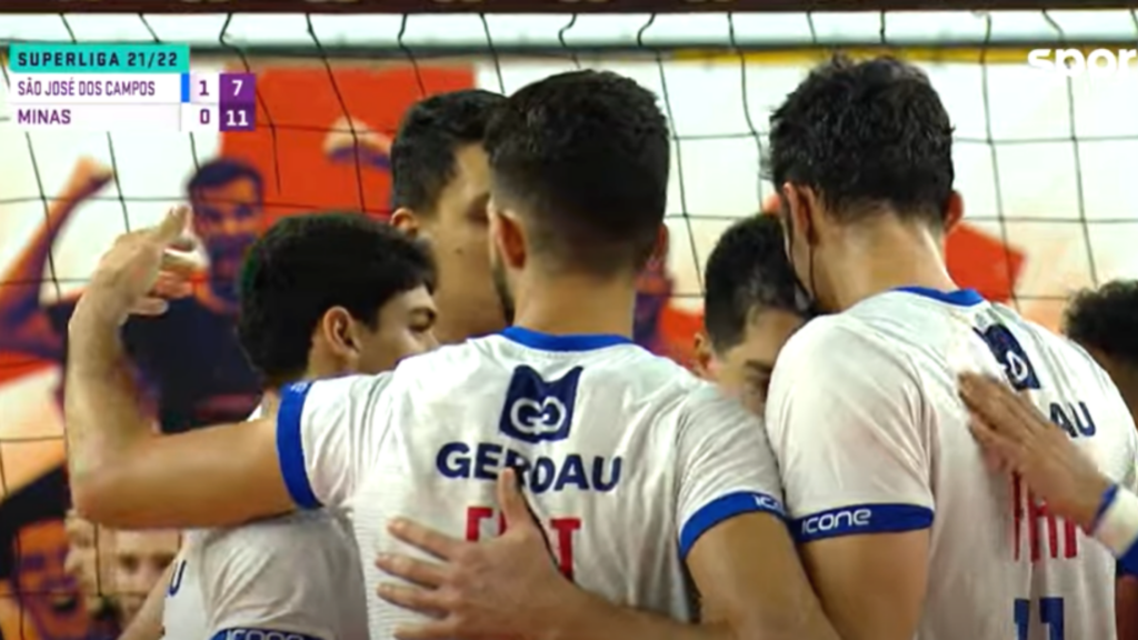 Jogadores de Minas e São José em quadra pela Superliga (Crédito: Transmissão/Sportv)